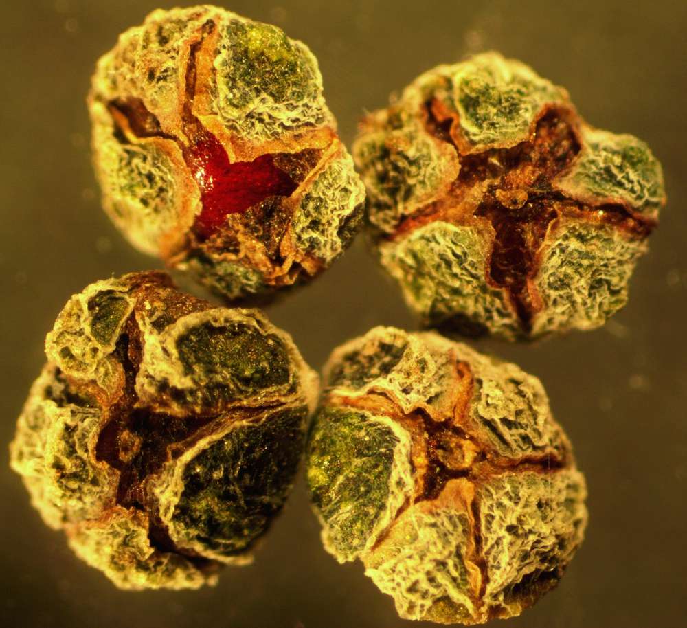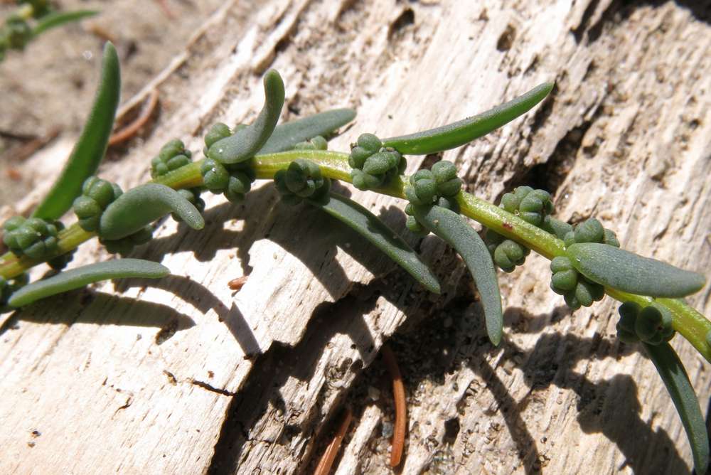 I think this is Suaeda maritima. From a coastal sand beach in Washington County, Maine. Sepals are rounded, without keels. This must be ssp. maritima because utricles are 1.7 mm long and longest (dried) leaves are >20 mm long. Is the red color of utricles diagnostic?