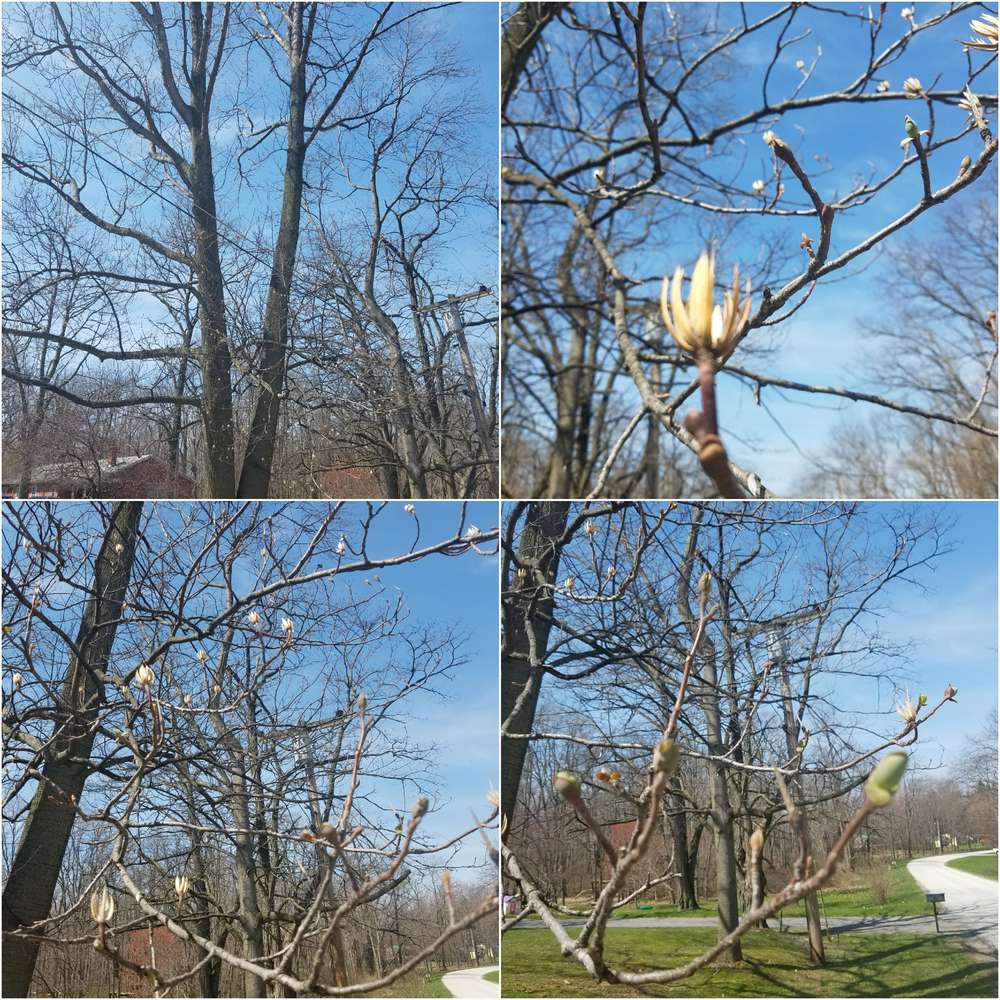 We saw this tree in NY on vacation peppered in the state parks near rivers in NJ & NY and in yards and along roadsides. We first noticed it in Ringwood New Kersey State Park and then in Barcelona, NY. It had a large, whitish-pink, cup-shaped flower pointing upward at tip of branches. It was not leafed out at all and the bark did not seem flaky but ridged. It was at least 60 feet tall with a very straight trunk. I am from Kansas and have never seen a tree like this. What is it?