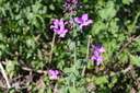 This photo was taken May 4, 2013 somewhere in the Monadnock Region of New Hampshire. The pink flowers each have four petals and bloom in a cluster. The leaf at the base of each flower stalk seems to clasp the stalk. The stem of the plant is hairy.