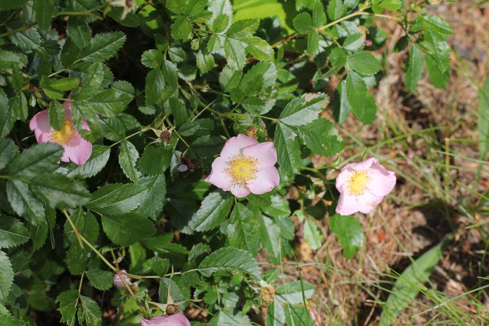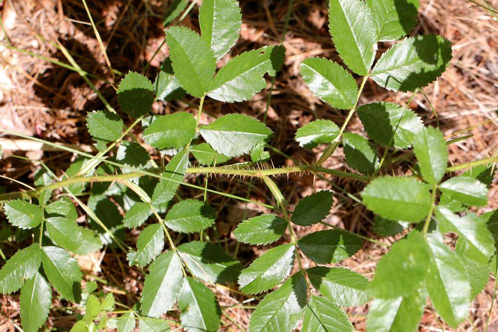 Dear Auntie, good morning. There are some details I cannot see, such has the hypanthium (the structure below the sepals on the flower), so I cannot write here with confidence. The solitary flowers, narrow stipules, and abundantly prickly stems suggests this is Rosa carolina. Best wishes.
