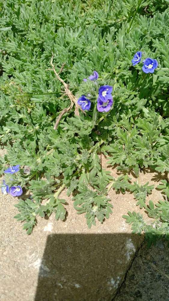 Dear normaholtby, the flowers belong to a species of Veronica (speedwell), based on the four petals (with the uppermost the largest) and two stamens. However, I do not know any species of speedwell with leaves of that outline. I can't help you any further with this question (unfortunately). Best wishes.