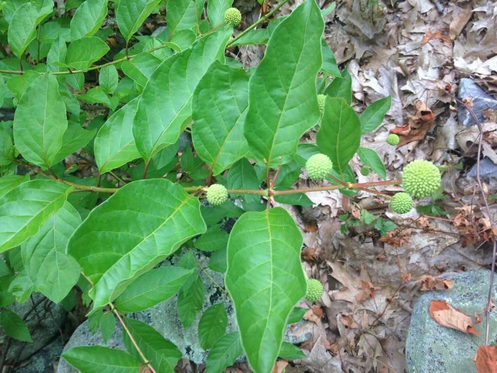 Dear DianeUP, the woody plant is Cephalanthus occidentalis (buttonbush), a native member of the Rubiaceae that is associated with wetlands and shorelines. The pink-flowered plant is Hylodesmum glutinosum (pointed-leaved tick-trefoil), a native plant of forests and forest clearings. Best wishes.