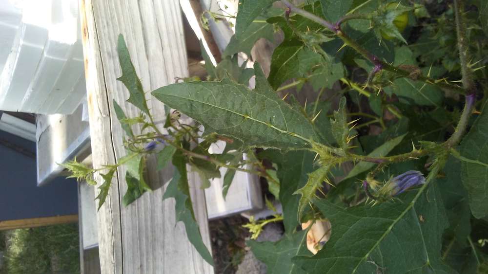 I've been trying to identify this plant. I think its a type of nightshade but can't find a photo that matches. It has white flowers that turn purple with yellow stamens. It stands about 18" and the baffling part is the thorns throughout. Any information will be appreciated. I am located in Saginaw MI. Thanks