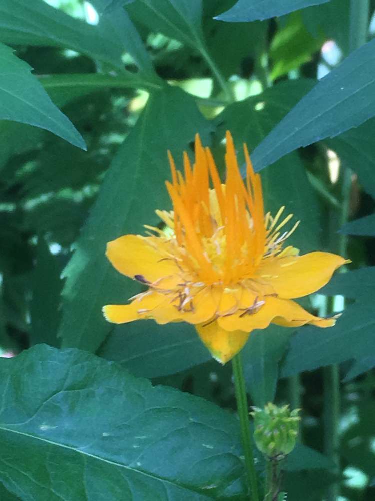 I don't have a photo of the leaves of this flower, photographed in June and July in Harrisville, NH. I think it is growing among other plants so the surrounding leaves don't belong to it. But the flower has gone by and I'm not sure where the plant is in the jungle of green. What is it and what are the standing orange "petals"?
