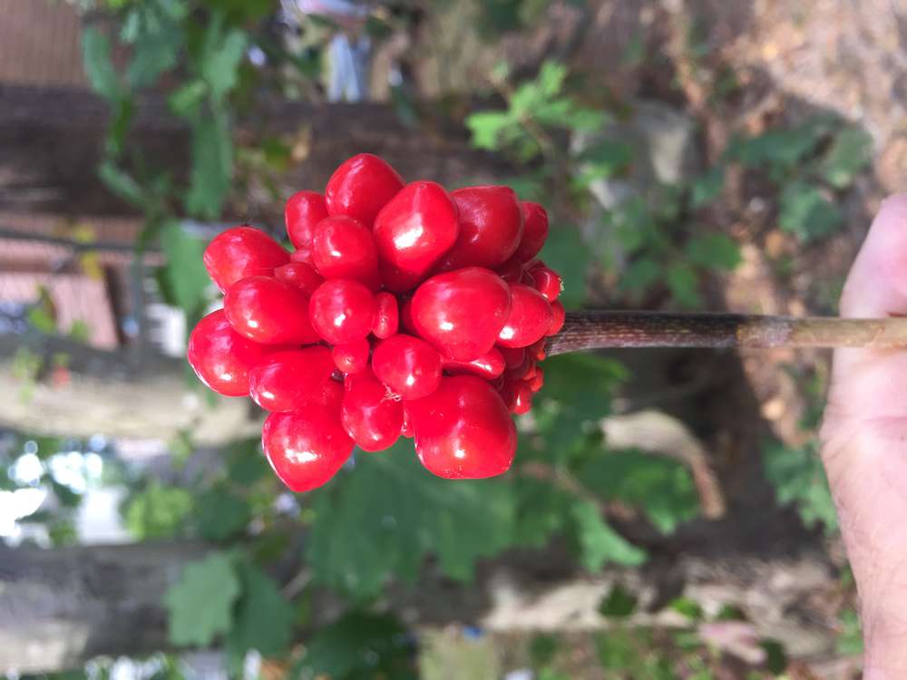 Dear JimB49, you've photographed the fruits of Arisaema triphyllum (Jack-in-the-pulpit). The leaves and enfolding spathe have senesced, but the fruits remain later in the season. Best wishes.