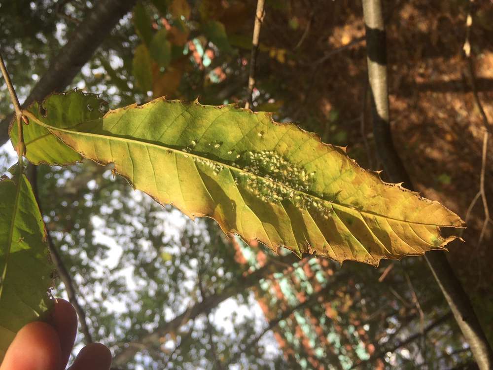 Photos show something that looks like quercus muenlenbergii to me but I gather that is rare so may not be likely. Found 4 individuals on a wooded path between the highway and an office parking lot in Burlington, MA. The tallest is about 20', trunk shown in photo. Also saw aphids on the underside of one leaf as shown which I cannot remember seeing on oak before. The area also has white oak, white pine, viburnum acerifolium, sassafrass, and juniper.
