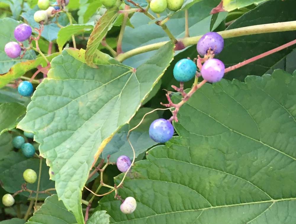 Dear whtien, you have photographed a species of peppervine (genus Ampelopsis). It is most likely Ampelopsis glandulosa (Amur peppervine), a non-native liana of the grape family.