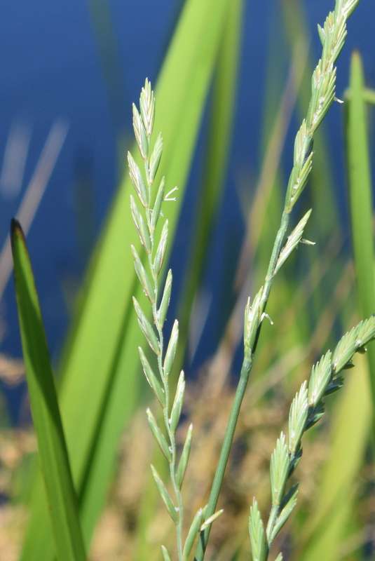 Dear SueLB, Your grass appears to be Elymus repens (creeping wild-rye). The flat side of the spikelets are against the rachis of the inflorescence and there are two glumes. If this was a species of Lolium (rye grass), it would have the edge set against the axis of the inflorescence and there would only be one glume per spikelet. I hope this is helpful.