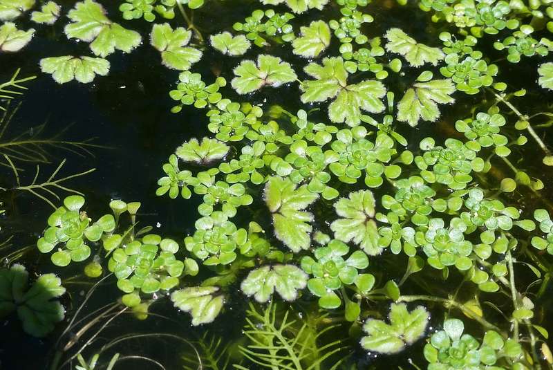 Dear SueLB, we will keep working together and make sure we can get your future questions answered. There are two species of floating life in this image, one of which I recognize because it is a tracheophyte (higher vascular plant). The ones with small leaves that are rounded at the apex and organized into a floating rosette are water-starworts (genus Callitriche). There are native and non-native species. To identify to the species, we need details of the fruits. I hope this is helpful and keep the questions coming.