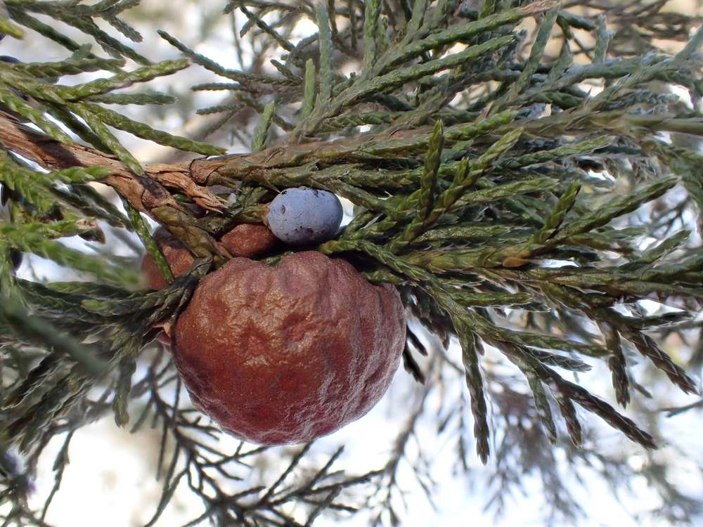 Question: I think the brown object beneath the berries on what I think is a Juniperus virginiana tree is some sort …