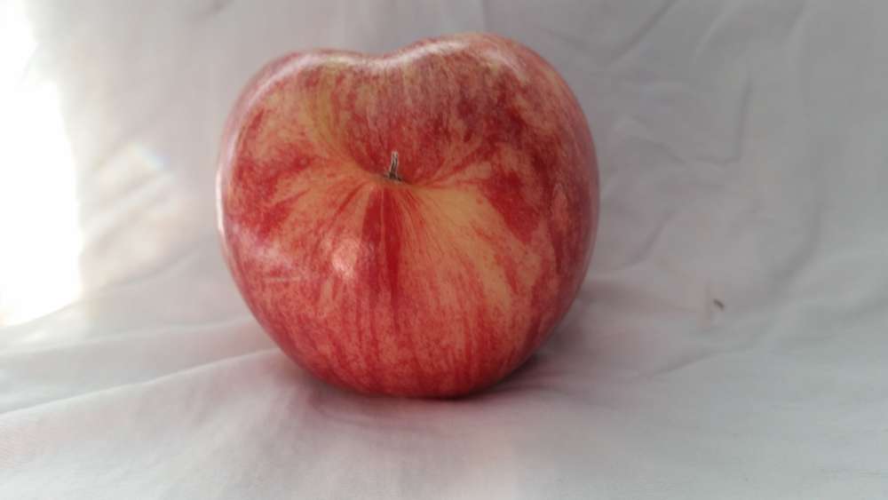 Question: The apple pictured is a of the Gala variety,typically striped.The stripes swirl around a brown protrusion. The protrusion is flexible,in …