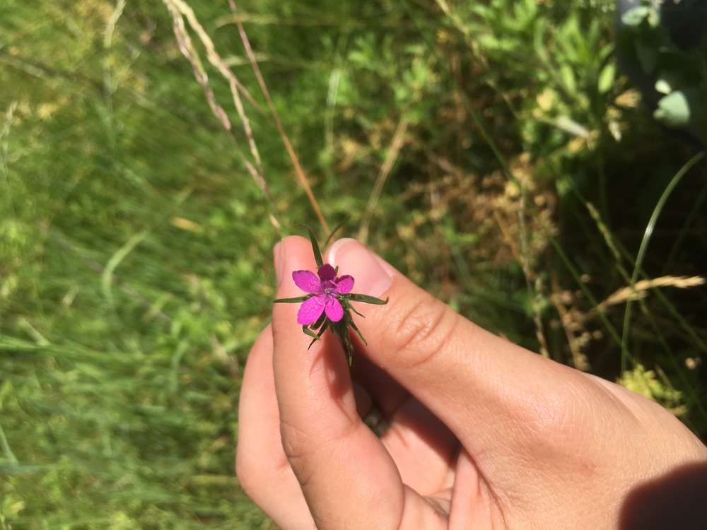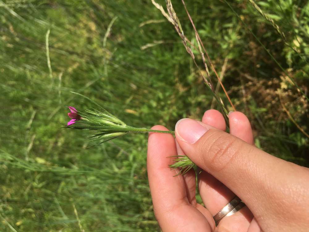 Dear kobrien, this plant is Dianthus armeria (Deptford pink), a member of the carnation family (Caryophyllaceae). It is found in open locations, such as fields and roadsides, similar to where you located this plant.