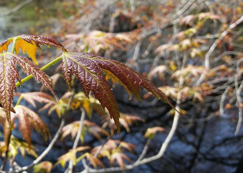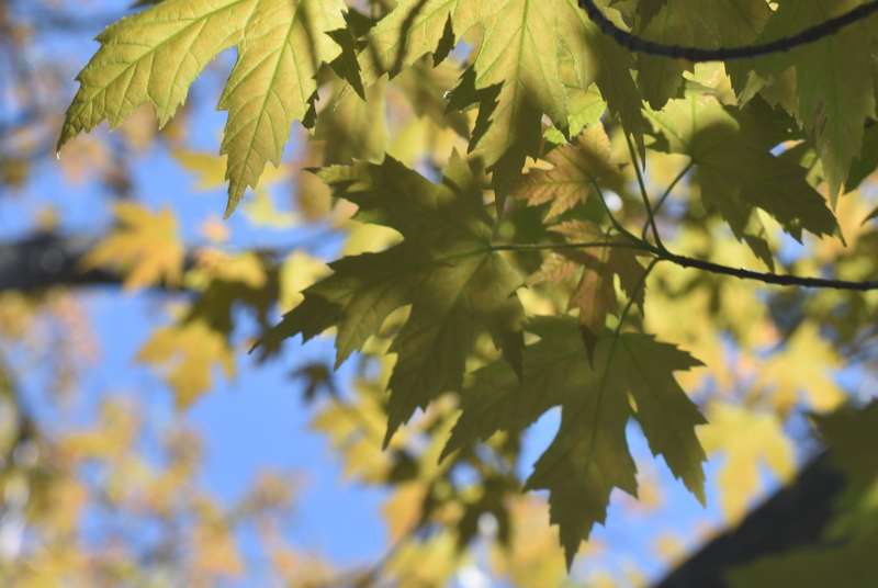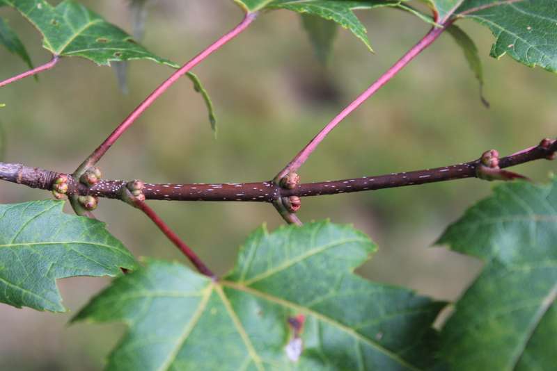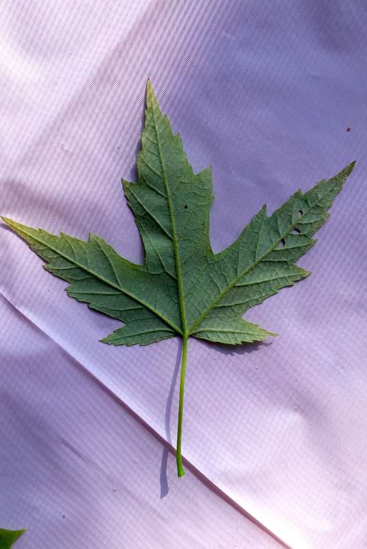 SueLB, the species you have photographed is Acer saccharinum (silver maple), a native species that usually inhabits flood plains. The deep sinuses on the leaf blades and arching branchlets are good morphological markers.
